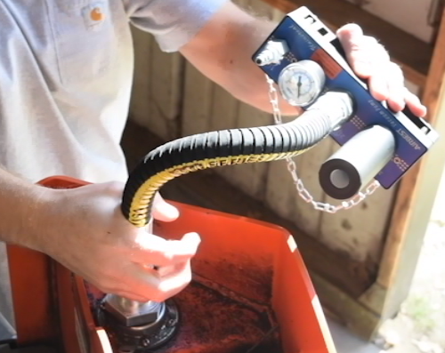 Simply remove the filler breather cap, connect The Mighty Tankholder, and supply standard shop air.